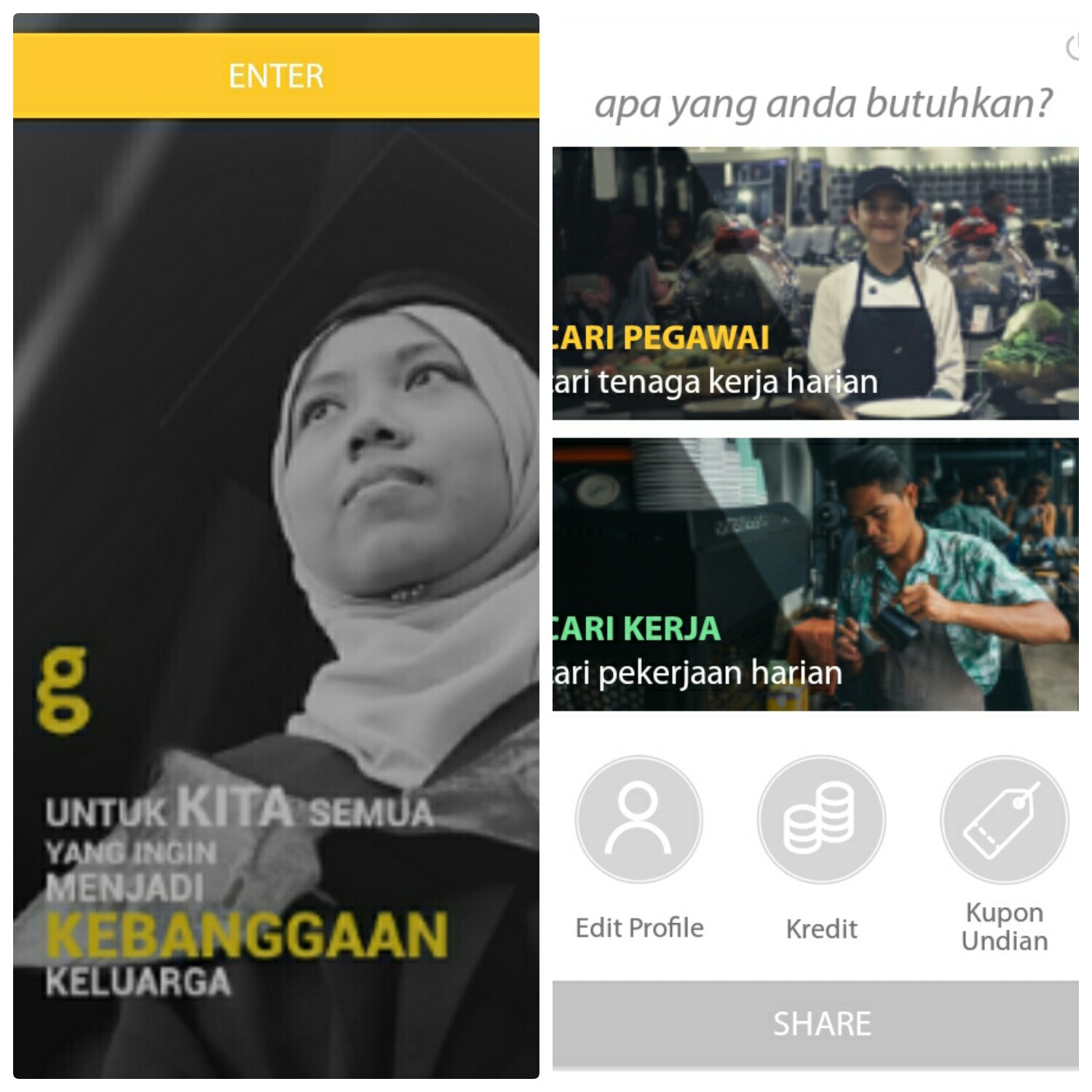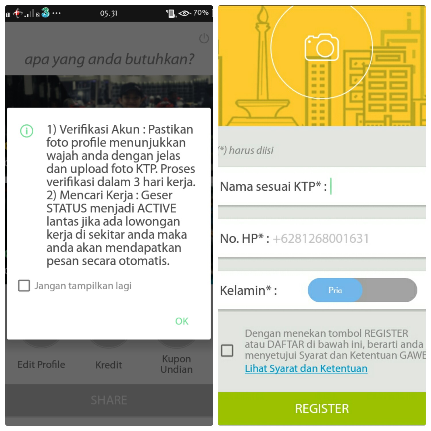 Tampilan awal dari aplikasi Gawe adalah gambar seorang wanita menggunakan baju toga dan ada kolom dengan tulisan Enter. Klik tulisan enter tersebut kemudian kita diminta memasukan no handphone yang nantinya akan digunakan untuk mengirim kode verifikasi. Setelah kita menerima kode verifikasi masukan kode tersebut di kolom yang sudah tersedia. Kita juga diminta memilih apakah daftar sebagai pencari tenaga kerja atau pencari kerja.