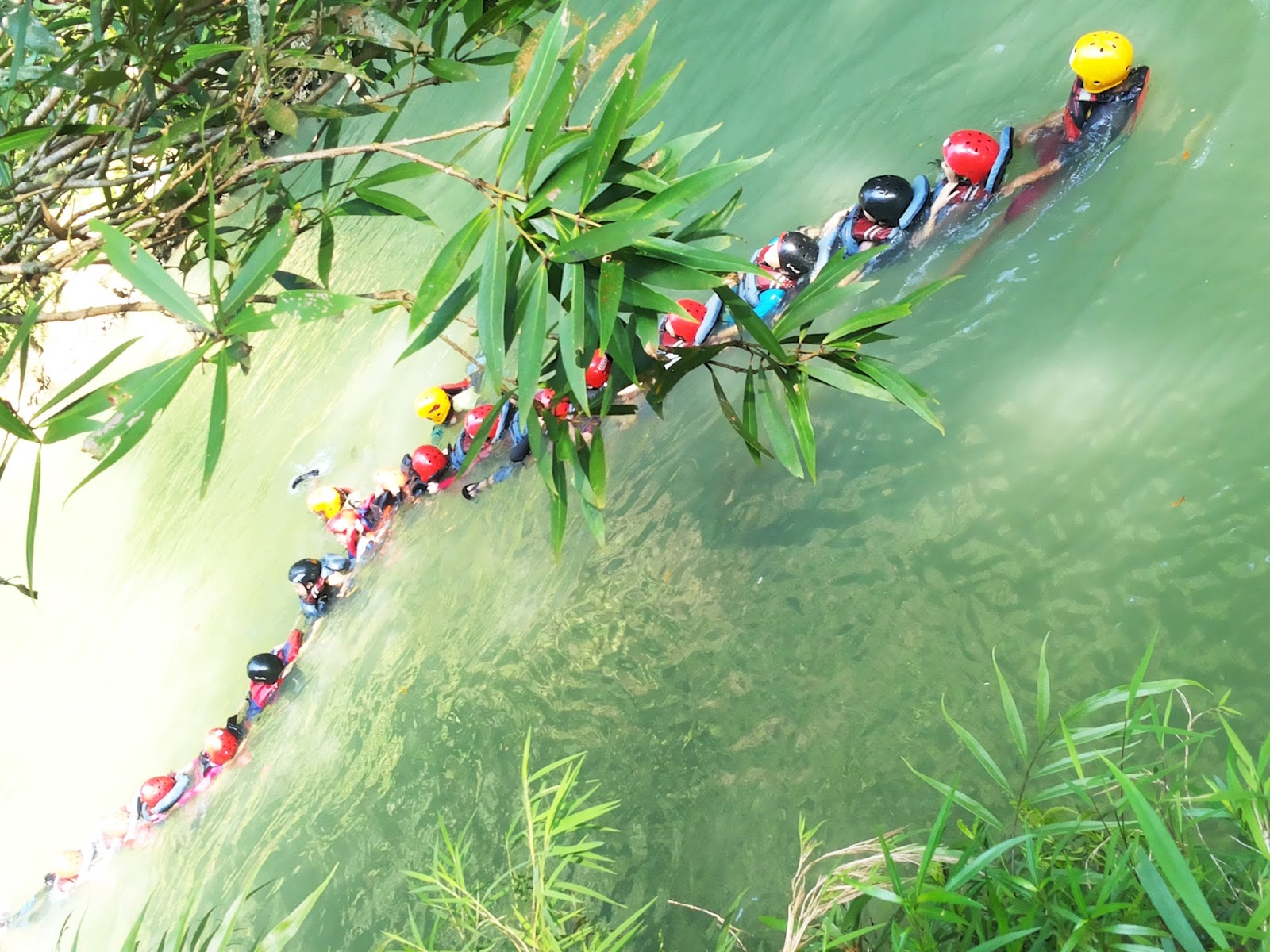 Saat aliran sungai tenang kami saling sambung-menyambung dengan teman yang lain dengan cara orang yang berada didepan kita badannya bertumpu pada kaki kita, begitu seterusnya hingga membuat barisan yang cantik apabila dilihat dari atas. Saat melewati aliran sungai yang deras atau ada bebatuan yang cukup besar, maka satu persatu dari kami akan dibantu oleh pemandu wisatanya.
