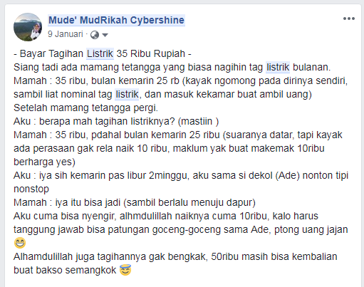 Contoh nyata saat aku menulis sebuah status tentang tagihan listrik di rumah yang hanya Rp.35.000,- saja, langsung komentar berderet, dan kebanyakan ya mamah-mamah muda dan sebangsanya.