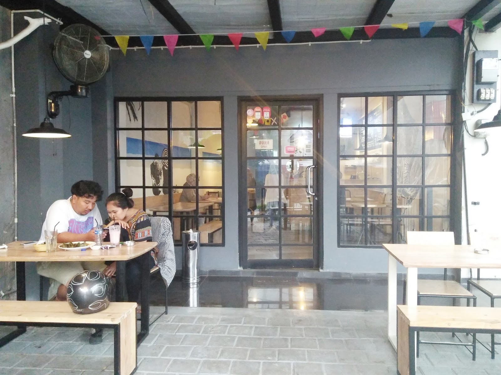 Sebenarnya temenku wihda pengin coba fish streat tapi kami urungkan karena ada sesuatu hal, dengan menggunakan angkutan mobil online sampailah kami di depan outlet Bomber Fish dengan selamat diantara rintik gerimis yang semakin deras membasuh tanah ibukota.