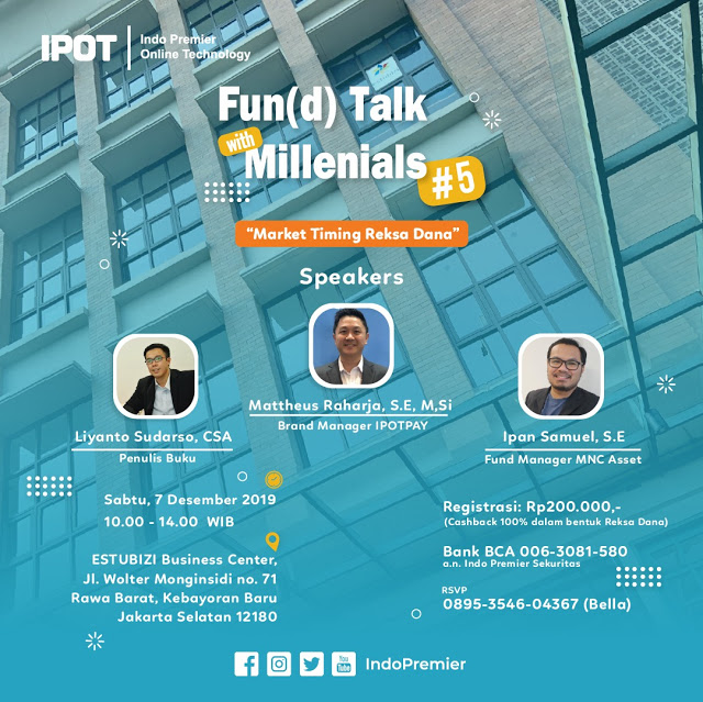 Dan kali ini IPOT mengadakan IPOTPAY Fun(d) Talk with Millennials dengan tema “Waktu yang Tepat Investasi Reksa Dana”. Acara ini bertujuan untuk meningkatkan pengetahuan masyarakat tentang produk pasar modal khususnya reksa dana.