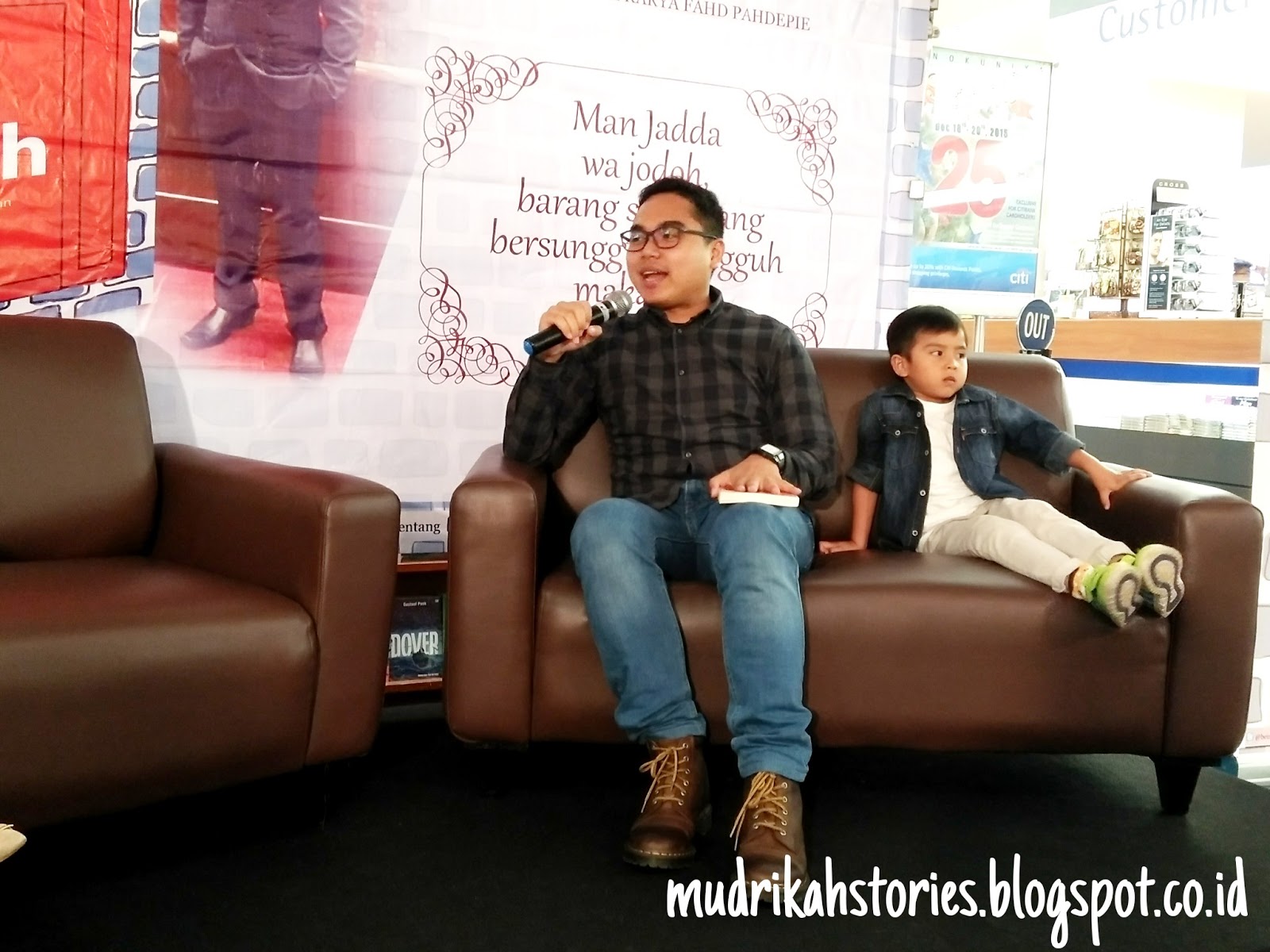 Acaranya dimulai pukul 15.00 sampai pukul 17.00, acaranya cukup menyenangkan. Dipandu oleh Natalia indri acara launching novel jodoh ini memberikan kesempatan para penggemar karya-karya fahd Pahdepie untuk berinteraksi langsung dengan sang idola. Saya sendiri baru pertama kali bertemu dengan kang Fahd serta menghadiri acara launching bukunya, saya hanya tahu beliau dari akun sosial media saja. Dari banyak postingannya saya lihat dia adalah seorang suami yang sangat menyayangi istrinya dan seorang ayah yang sangat mencintai anak-anaknya. Dan terbukti pada saat acara berlangsung si kecil Kalky terus nempel pada papinya ini dan The Rizqanya sendiri dengan setia menemani di kursi penonton sambil menggendong si kecil kemi, ini membuktikan dia memang dicintai oleh keluarga.