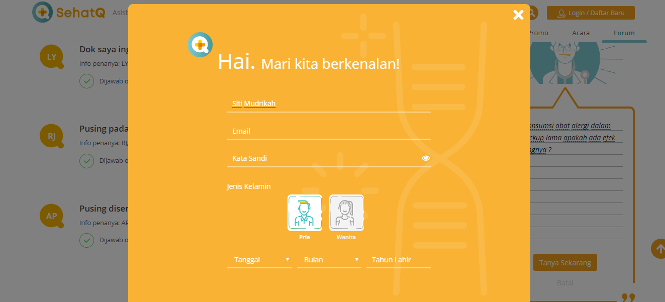 Selain informasi pasti yang sudah disediakan di Sehatq.com, kita juga bisa melayangkan pertanyaan di layanan kesehatan digital di menu forum tanya jawab dengan tim dokter. Nah tetapi untuk memberikan pertanyaan kepada dokter kita harus login terlebih dahulu, apabila belum registrasi kita bisa registrasi terlebih dahulu, caranya :