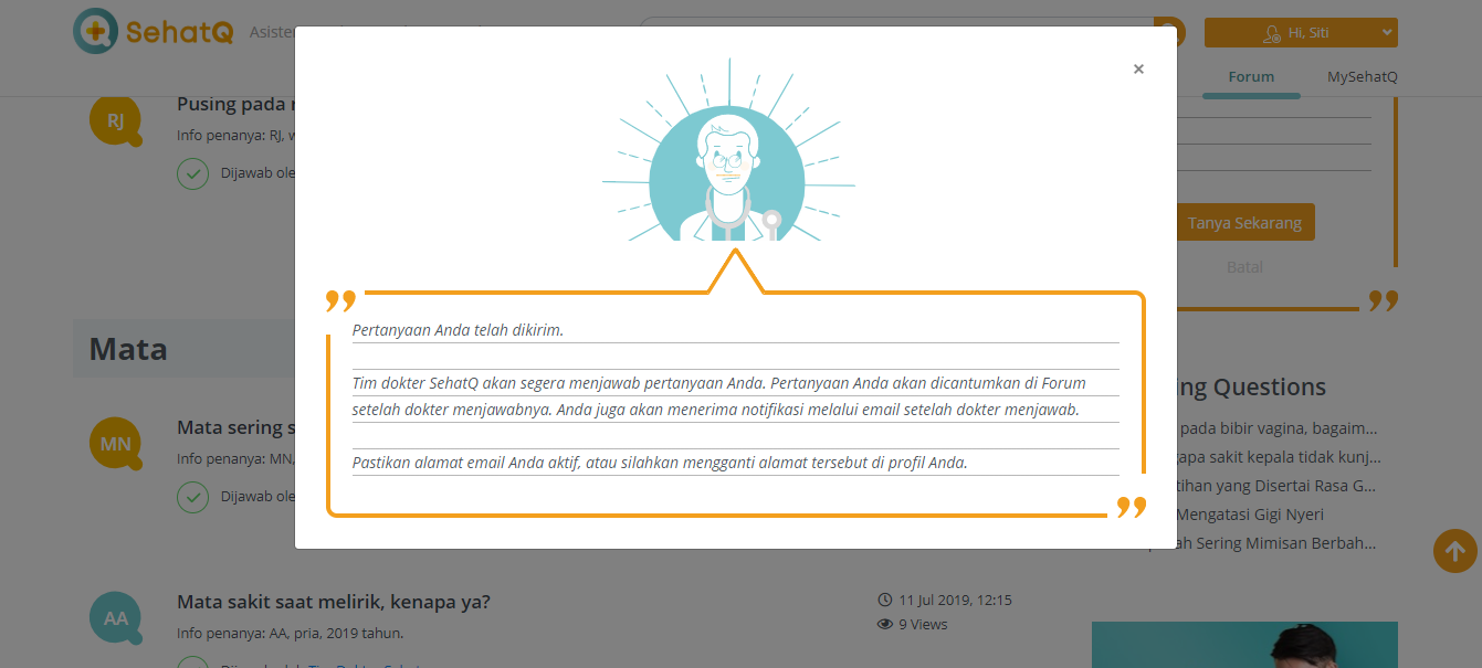 Lalu setelah berhasil registrasi kita bisa langsung mengirimkan pertanyaan kita pada kolom forum, nanti jawabannya akan dikirimkan melalui email pribadi serta akan ditayangkan juga di website SehatQ.com.