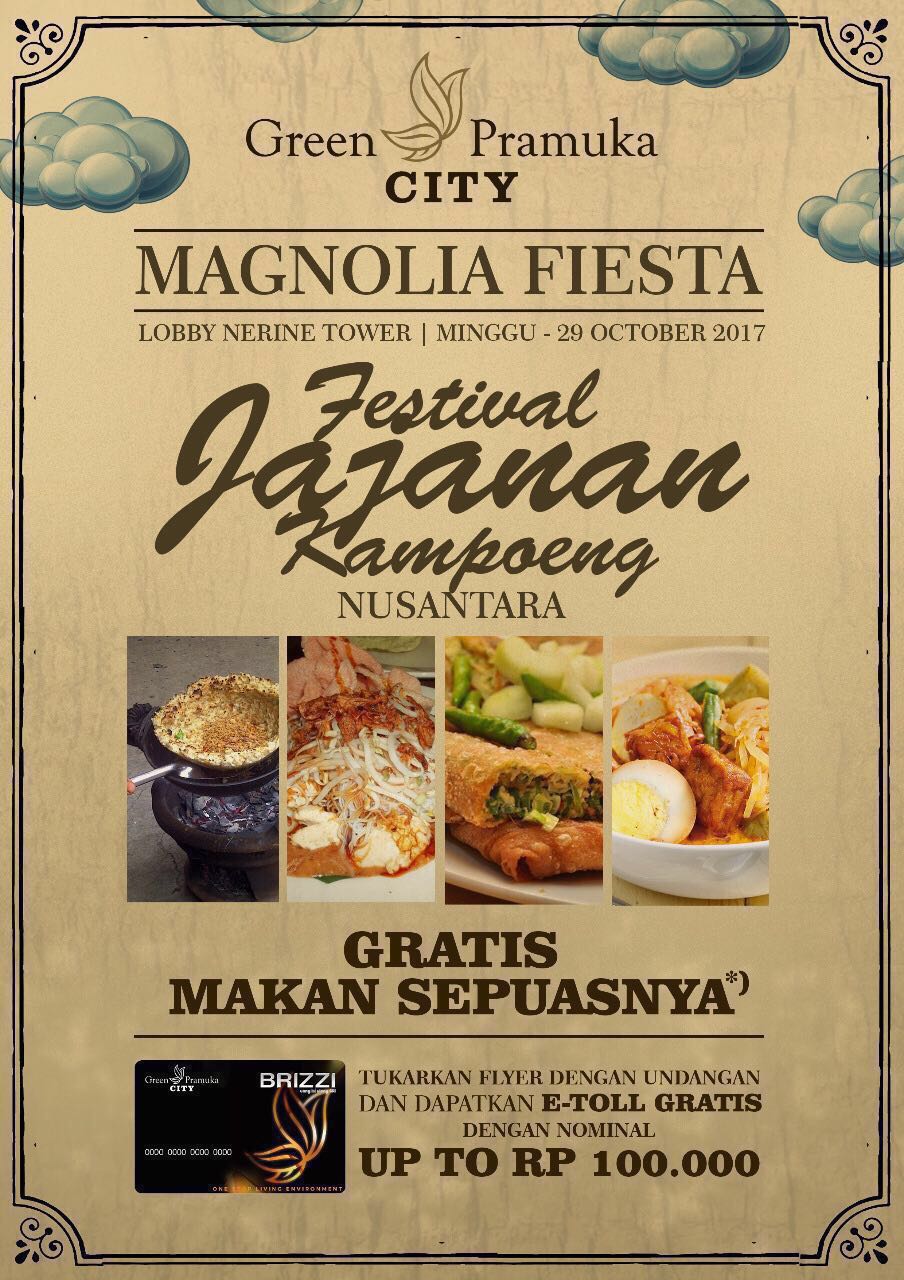 Jakarta, 29 Oktober 2017, Green Pramuka City sebagai pengembang yang kredibel, pada hari ini kembali menunjukkan komitmennya dalam memberikan layanan terbaik dengan menghadirkan sebuah event bertajuk Magnolia Fiesta Festival Jajanan Kampoeng Nusantara yang berlokasi di area Green Pramuka. acara ini berlangsung mulai pukul 10.00 pagi, menghadirkan ragam kuliner nusantara yang dapat dinikmati secara gratis oleh para pecinta kuliner.
