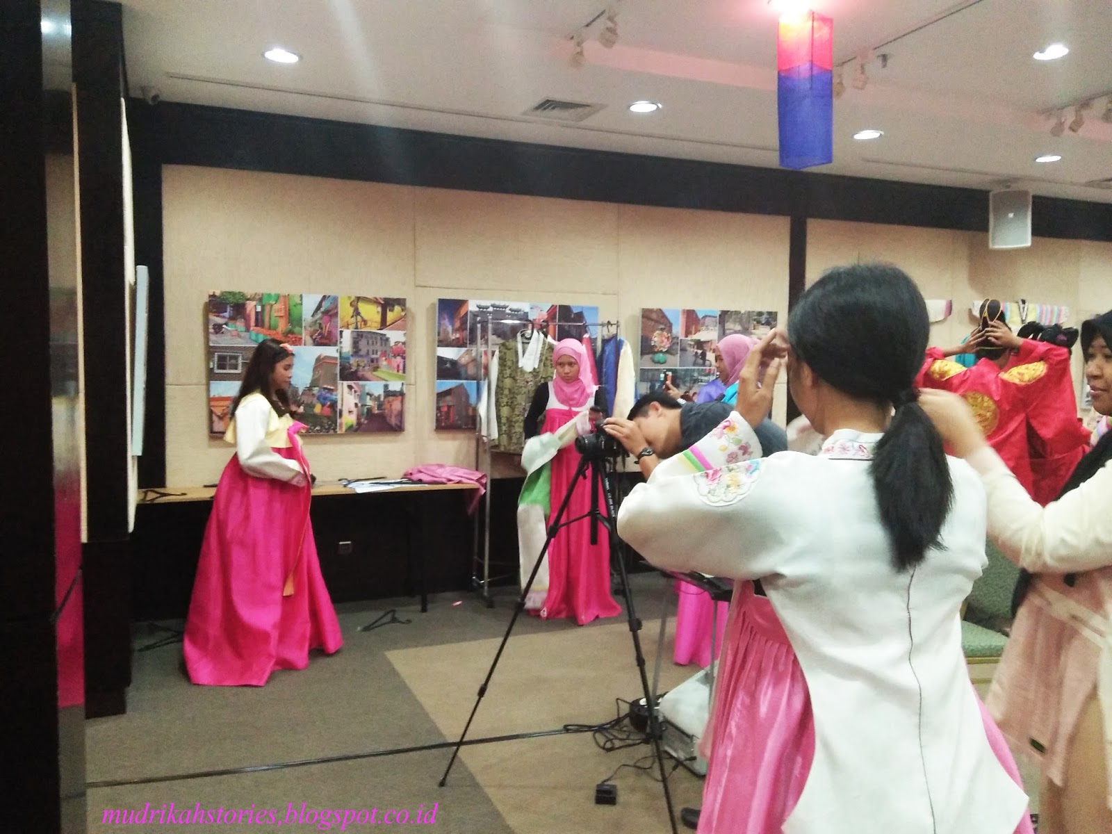 Setelah mendengar penjelasan dan melihat cara menggunakan hanbok, kami diberikan kesempatan untuk mencoba sendiri hanbok secara bergantian dan kemudian melakukan foto studio untuk mengabadikan moment ini. Saya senang sekali bisa mencoba memakai hanbok, tapi sayangnya karena hanbok yang disediakan terbatas dan peminatnya sangat banyak jadi waktu yang diberikan hanya sebentar karena harus gantian dengan yang lain.