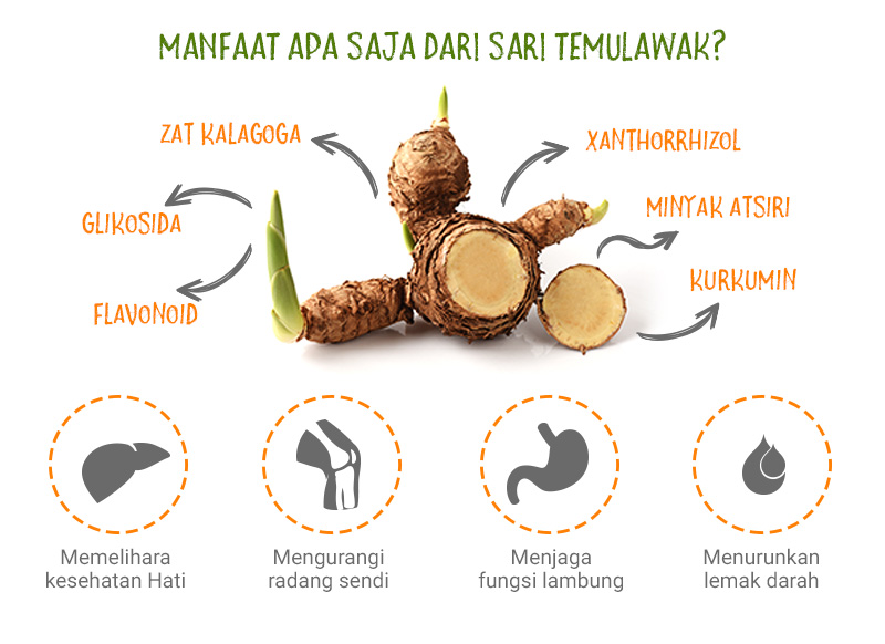Temulawak ini diantaranya mengandung Zat Kalagoga sebagai penghasil empedu, zat kurkumin sebagai penurun lemak darah juga mengurangi rasa nyeri pada sendi.