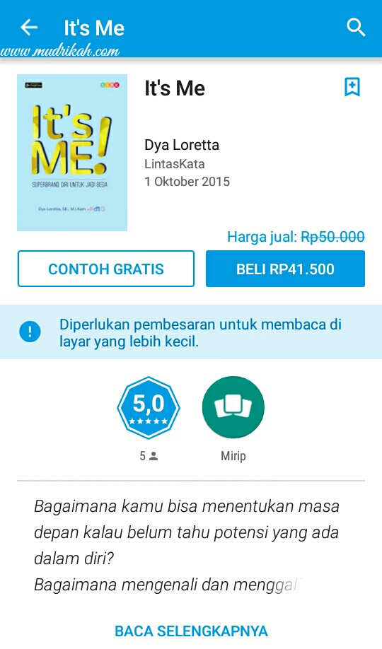 Kalo belum sempet ke toko buku kalian juga bisa cek di google play book ketik saja keywordnya : dyaloretta atau it’s me superbrand diri untuk jadi beda, harganya bersahabat kok.