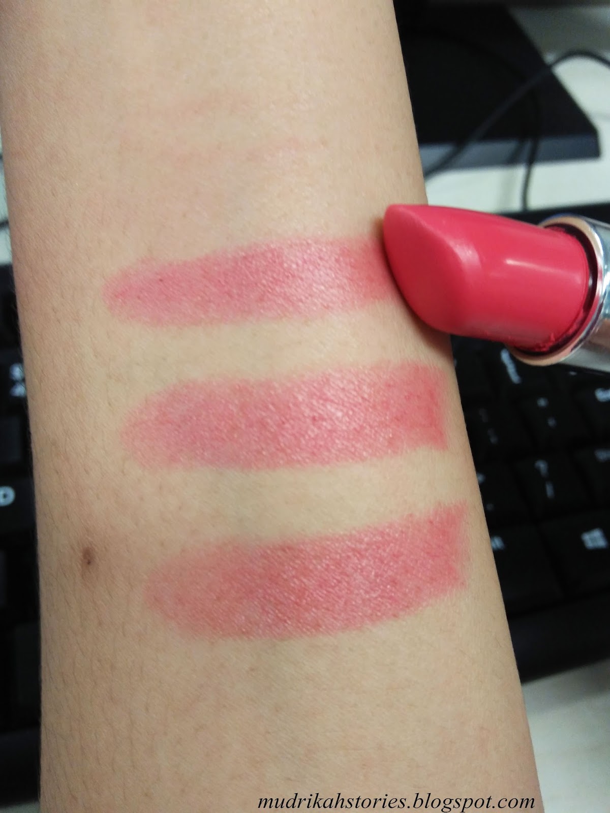 Pas liat warnanya di lipstick tester aku langsung suka padahal tau enggak, itu si lipstick testernya lagi dipegang orang, dan aku lagi coba-coba warna lain. Mba yang lagi nyoba si lipstick lama banget gak selesai-selesai aku beraniin aja permisi mau ikut nyoba juga. Akhirnya langsung deh aku pilih warna ini, dari warna nya sih aku suka dan pas dicoba gk terlalu kering.