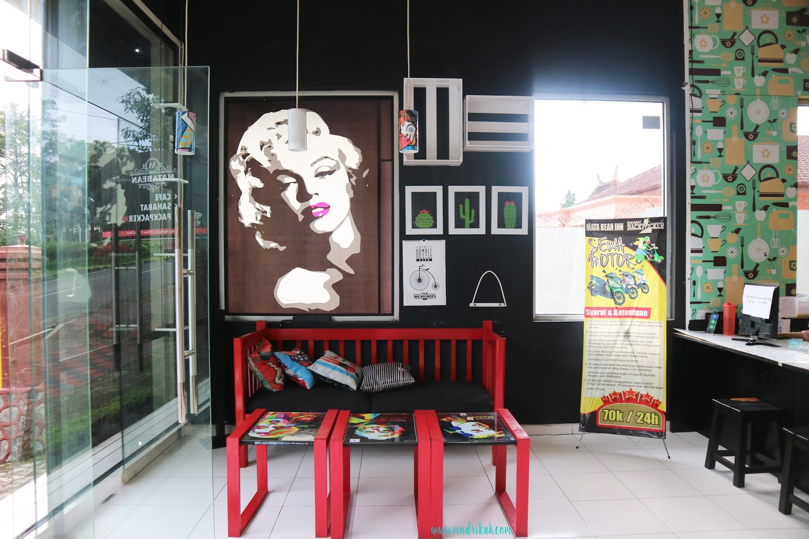 Penginapan ini luas banget di bagi menjadi beberapa area dibagian depan ada Cafe yang merangkap dengan lobby kedatangan, tempatnya kece dan instagramable banget. Cafe ini tidak hanya untuk tamu hotel tetapi untuk masyarakat umum juga bisa, jadi kayak cafe buat nongkrong biasa. Kami sempat mencoba menu di cafe ini, harganya lumayan terjangkau sekitar 10 rb – 40 rb untuk makanan dan minuman.
