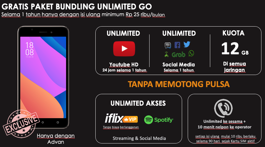 Selain spesifikasi yang sudah di jelaskan sebelumnya, smartphone Advan S50 4G ini dibundling dengan IM3 Indosat Ooredoo Gratis akses YouTube dan social media 24 jam setahun (Unlimited), Plus kuota tambahan 12 GB selama tahun (Untuk Browsing dan Download).
