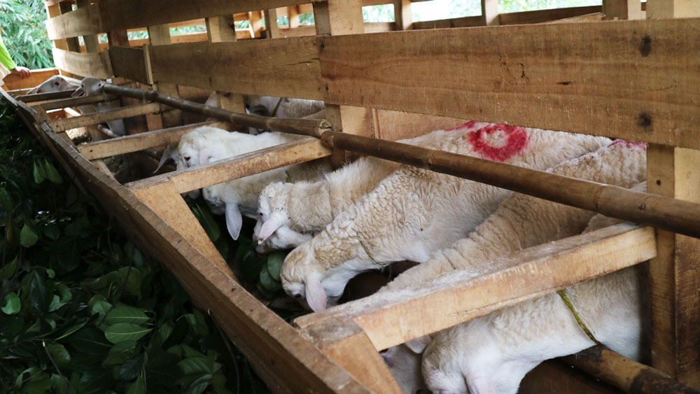 berupa rumput hijau hanya 20% saja, sisanya sebanyak 80% pakan berasal dari jerami padi, limbah kulit nanas, daun nanas, daun pohon kayu yang kemudian dihaluskan menggunakan mesin. Hal ini sangat bermanfaat pada saat musim kemarau seperti saat ini karena ketersediaan rumput hijau cukup langka, maka bisa diganti dengan pakan hasil olahan limbah perkebunan. Kemudian kotoran domba nantinya akan diolah menjadi pupuk kompos yang digunakan untuk memupuk tananam perkebunan.
